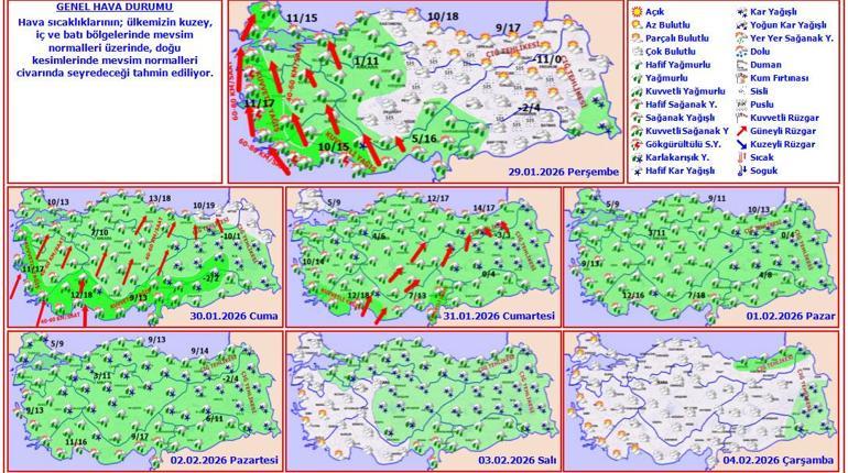 En düşük ve en yüksek hava sıcaklıklarının, aralıklı sağanak görülecek yarın 7-13, parçalı ve çok bulutlu, akşam yağmurlu geçecek 31 Ocak Cumartesi 5-8, çok bulutlu, sağanak yağmurlu geçecek 1 Şubat Pazar ise 4-7 derece olacağı tahmin ediliyor.