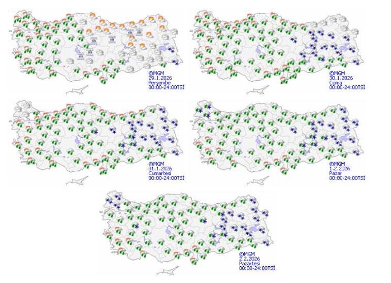 Yurt genelinin parçalı ve çok bulutlu, Marmara, Ege, Akdeniz, Batı Karadeniz, İç Anadolu’nun kuzey ve batısı ile Güneydoğu Anadolu’nun batısı ile Nevşehir ve Karaman çevrelerinin yağmur ve sağanak yağışlı, Doğu Anadolu’nun güneydoğusunun kar yağışlı geçeceği tahmin ediliyor. Yağışların Marmara’nın batısı, Kıyı Ege ve Batı Akdeniz ile Manisa ve Denizli’de yerel kuvvetli olması bekleniyor. Gece ve sabah saatlerinde iç ve doğu bölgelerde buzlanma ve don ile birlikte pus ve yer yer sis beklenirken, Doğu Karadeniz’in iç kesimlerinin yüksekleri ile Doğu Anadolu’nun doğusunda yüksek kar örtüsüne sahip eğimli kesimlerde çığ tehlikesi bulunuyor.