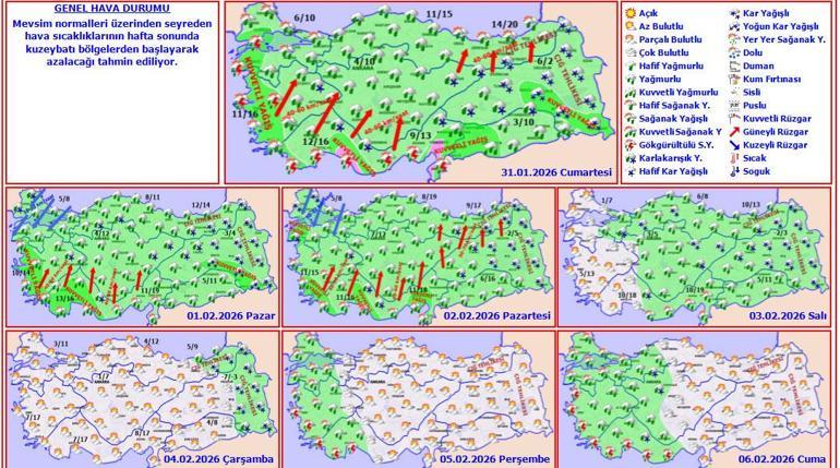 Meteoroloji Genel Müdürlüğü olarak yapılan değerlendirmelere göre: Yurt genelinin çok bulutlu ve yağışlı geçeceği tahmin ediliyor. Genellikle yağmur ve sağanak, Kıyı Ege ile Akdeniz kıyılarında yer yer gök gürültülü sağanak, İç Ege’nin yüksekleri, İç Anadolu’nun kuzeydoğusu, Karadeniz’in iç kesimleri ve Doğu Anadolu’da karla karışık yağmur ve kar şeklinde görülmesi beklenen yağışların, Kıyı Ege, Akdeniz kıyıları, Güneydoğu Anadolu’nun batısı ile Çanakkale, Tekirdağ, Kahramanmaraş, Bingöl, Muş, Bitlis, Şırnak ve Hakkari çevrelerinde kuvvetli, Antalya’nın doğusu ile Hatay ve Osmaniye çevrelerinde yer yer çok kuvvetli olacağı tahmin ediliyor. Doğu bölgelerde buzlanma ve don olayı bekleniyor. Doğu Karadeniz’in iç kesimlerinin yüksekleri ile Doğu Anadolu’nun doğusunda yüksek kar örtüsüne sahip eğimli kesimlerinde çığ tehlikesi bulunmaktadır.