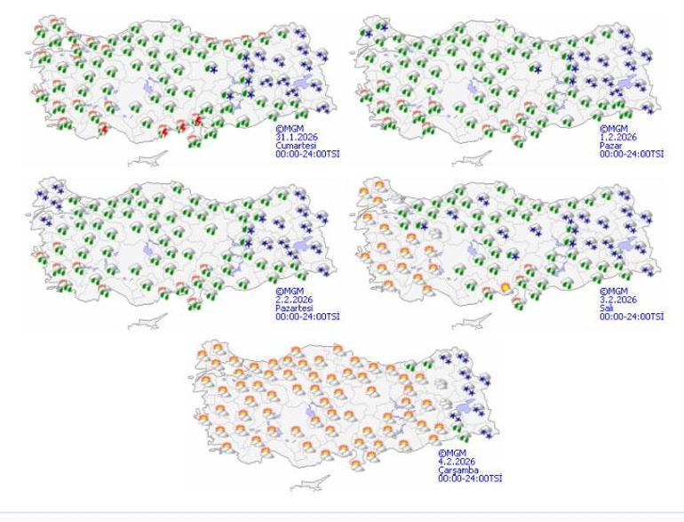 KUVVETLİ YAĞIŞ UYARISI: Yağışların, Kıyı Ege, Akdeniz kıyıları, Güneydoğu Anadolu’nun batısı ile Çanakkale, Tekirdağ, Kahramanmaraş, Bingöl, Muş, Bitlis, Şırnak ve Hakkari çevrelerinde kuvvetli, Antalya’nın doğusu ile Hatay ve Osmaniye çevrelerinde yer yer çok kuvvetli olması beklendiğinden oluşabilecek olumsuzluklara karşı (ulaşımda aksamalar, buzlanma ve don olayı, kar örtüsüne sahip düşük rakımlı yerlerde yağışla birlikte kar erimesi, çığ riski ile yağmur yağan yerlerde sel, su baskını vb.) dikkatli ve tedbirli olunması gerekmektedir.