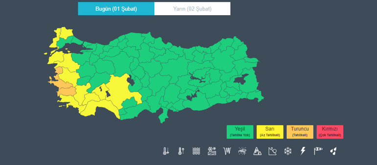 2 il için turuncu 11 il için de sarı kodlu uyarı yapıldı. İzmir ve Aydın için turuncu kodlu alarm verilirken sarı kodlu uyarı yapılan iller ise Antalya, Balıkesir, Burdur, Çanakkale, Denizli, Edirne, Isparta, Kırklareli, Konya, Manisa, Muğla oldu.