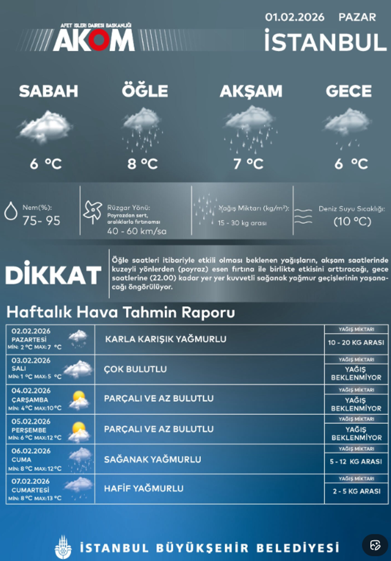 İstanbul Büyükşehir Belediyesi Afet Koordinasyon Merkezi (AKOM) İstanbul için yağış uyarısı paylaştı.