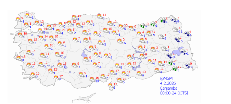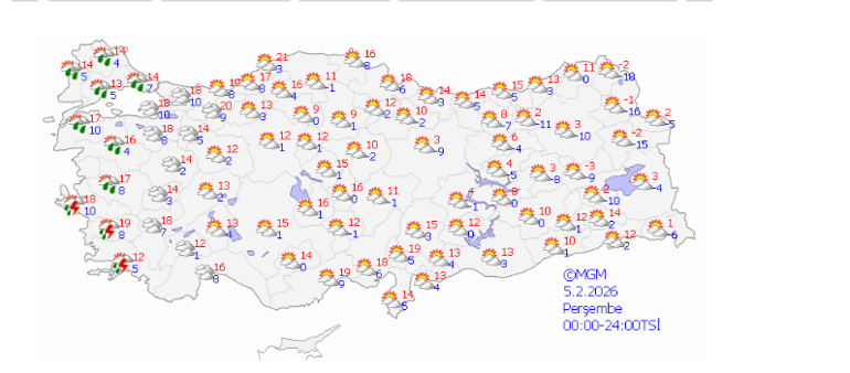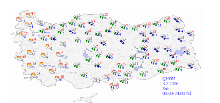 Genellikle yağmur ve sağanak, Trakya kesimi, Batı Akdeniz’in Toroslar mevkii, Doğu Karadeniz’in iç kesimleri ile Doğu Anadolu’nun kuzey ve doğusunda karla karışık yağmur ve kar şeklinde görülecek olan yağışların; Kıyı Ege, İstanbul, Bursa, Çanakkale, Balıkesir, Manisa, Uşak, Denizli, Antalya, Isparta’nın güneyi, Burdur’un doğusunda kuvvetli olması bekleniyor.