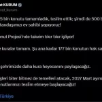 “Nasıl ki 455 bin konutu tamamladık, teslim ettik; şimdi de 500 bin yuvayla vatandaşımızı ev sahibi yapıyoruz! Yüzyılın Konut Projesi’nde takvim tıkır tıkır işliyor! 50 ilimizde kuralar tamam. Şu ana kadar 177 bin konutun hak sahibini belirledik. Bu hafta 7 şehrimizde daha kura heyecanını paylaşacağız. Kura çekilişleri biter bitmez de temelleri atacak, 2027 Mart ayından itibaren konutlarımızı teslim etmeye başlayacağız.”