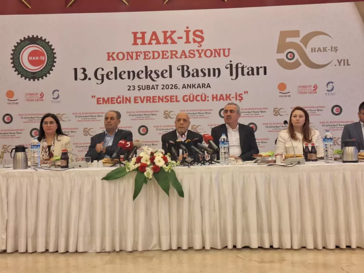 HAK-İŞ Genel Başkanı Mahmut Arslan, Ankara’daki bir restoranda düzenlenen iftar programında, basın mensuplarıyla bir araya geldi. Arslan, HAK-İŞ’in 50’nci yılını 22 Ekim’de kutladıklarını söyleyerek, “50 yıllık tarihi mücadelemizin bizim açımızdan önemini, yaşadığımız zorlukları, başarı hikayelerimizi uzun uzun tartıştık, konuştuk, değerlendirdik. ve 2026 yılı 22 Ekim’ine kadar ‘Türkiye Buluşmaları’ adı altında çeşitli etkinlikleri gerçekleştireceğiz. Bu etkinliklerimizin biri olan 1 Mayıs Uluslararası Birlik, Mücadele ve Dayanışma Günü’nü bu yıl Bursa’da gerçekleştireceğiz. 1 Mayıs öncesindeki haftayı, 1 Mayıs haftası olarak geçen yıl olduğu gibi bu yılda gerçekleştirmeyi planlıyoruz. 5 ilde bölgesel toplantıları gerçekleştireceğiz; Manisa’da, Sivas’ta, Ordu’da, Elazığ’da ve sonunda bu toplantılarımızın finalini Bursa’da 1 Mayıs’ı yaparak gerçekleştireceğiz. 1 Mayıs Uluslararası Birlik, Mücadele ve Dayanışma Günü, geçen yıllarda olduğu gibi çalışma hayatının temel konularını bir kez daha kitlelerle buluşarak tekrar masaya yatıracağız. Bu yılki 1 Mayıs etkinliklerimize uluslararası sendikal hareketin de önemli bir parçası olan Sudan işçi hareketinin liderlerini inşallah Türkiye’de buluşturacağız. Türkiye’de, Sudan’da olup bitenlerle ilgili ortak bir basın toplantısı yapacağız. Birleşik Arap Emirlikleri Büyükelçiliği’nin önünde bir protesto eylemi yapacağız. 1 Mayıs’ta da Sudanlı sendikacılarla Bursa’da beraber olacağız. Yine konfederasyonumuzun geleneksel hale getirdiği 15’inci Uluslararası Kadın Emeği Buluşması’nı da bu yıl 5 Mart tarihinde Ankara’da gerçekleştireceğiz” dedi.