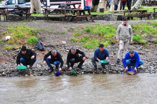 Yağışlı havaya rağmen çalışmalara ara verilmezken, altın avcıları dereye girerek arama faaliyetlerini sürdürdü. Küreklerle dere yatağındaki kumu çıkaran katılımcılar, ‘pan’ adı verilen eleme kaplarıyla altın taneciklerini ayıkladı. Zorlu hava koşullarına rağmen yapılan çalışmalarda birçok katılımcının altın bulduğu, etkinliğe katılanların yüzünün güldüğü görüldü.