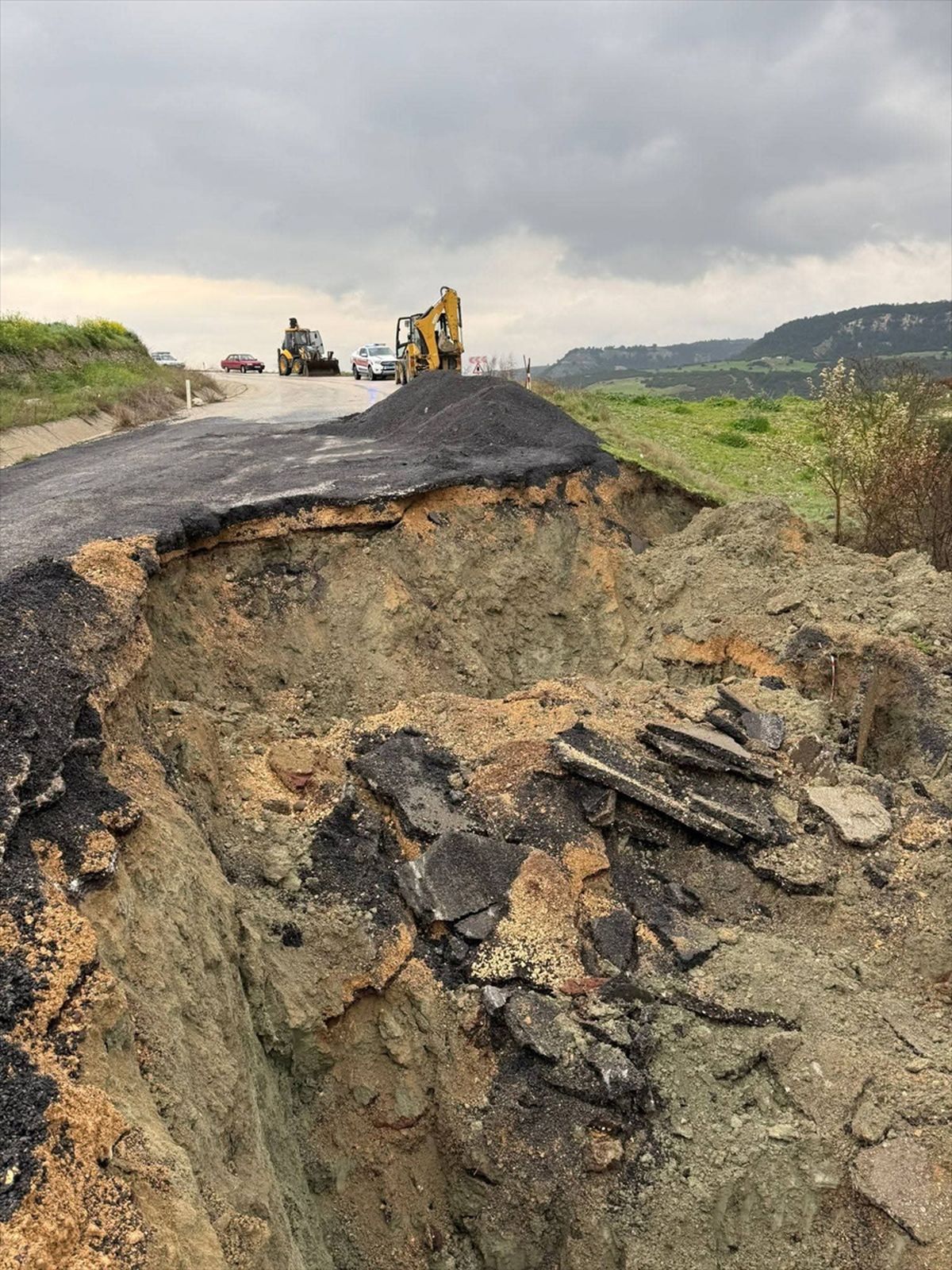 Manisa‘nın Selendi ilçesinde etkili olan yağışlar nedeniyle çöken ve trafiğe kapatılan yolda çalışmalar sürüyor.