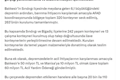 İLETİŞİM Başkanlığı, Sındırgı'da depremzedelere konteyner verilmediği iddialarının asılsız olduğunu belirtti. Bölgeye 320 konteyner sevk edildi ve 263'ü kuruldu. Ayrıca, acil yardım olarak 60 milyon T...