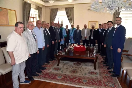 Manisa'da 38. Ahilik Haftası etkinlikleri kapsamında, MESOB Başkanı Hasan Geriter ve oda başkanları Vali Vahdettin Özkan'ı ziyaret etti. Vali Özkan, Ahilik geleneğinin toplum için önemini vurguladı....