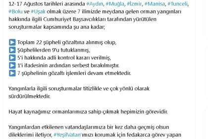 ADALET Bakanı Yılmaz Tunç, 12-17 Ağustos tarihleri arasında 7 ilde meydana gelen orman yangınları hakkında ilgili Cumhuriyet Başsavcılıkları tarafından yürütülen soruşturmalar kapsamında toplam 22 şüp...
