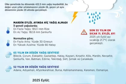 Meteoroloji Genel Müdürlüğü raporlarına göre 2025 yılında Türkiye genelinde 12 aylık yağışlar son 52 yılın en düşük seviyesine ulaşırken, Eylül ayı da son 55 yılın en sıcak 11. ayı oldu. Güneydoğu Ana...