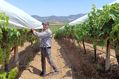 Manisa'nın Sarıgöl ilçesinde, Dadağlı, Dindarlı ve Alemşahlı mahallelerinde, üzüm bağlarını aşırı sıcak havalara rağmen örtü altına alma çalışmaları sürdürüyor. Üzüm ovasında çalışan işçiler, yüksek s...