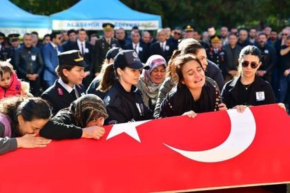 Manisa'nın Alaşehir ilçesinde sabah saatlerinde görev başındayken geçirdiği trafik kazasında şehit olan polis memuru Ali Barut, görev yaptığı Alaşehir İlçe Emniyet Müdürlüğü binası önünde düzenlenen ...