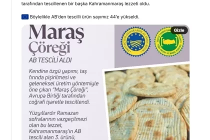 Tarım ve Orman Bakanı İbrahim Yumaklı, Kahramanmaraş'ın ünlü çöreğinin Avrupa Birliği'nden coğrafi işaret tescili aldığını duyurdu. Böylece, tescilli ürün sayısı 44'e yükseldi....