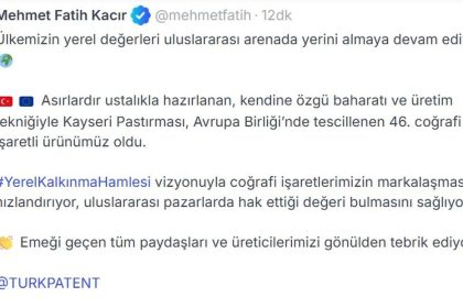 Sanayi ve Teknoloji Bakanı Mehmet Fatih Kacır, Kayseri pastırmasının Avrupa Birliği'nden coğrafi işaret tescili alan 46'ncı ürün olduğunu duyurdu. Yerel değerlerin uluslararası alanda tanınmasının öne...