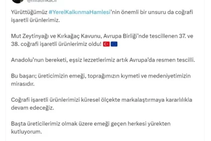 Sanayi ve Teknoloji Bakanı Mehmet Fatih Kacır, Mut zeytinyağı ve Kırkağaç kavununun Avrupa Birliği'nde tescil edildiğini açıkladı. Bu ürünler, Türkiye'nin coğrafi işaretli ürünleri arasında 37'nci ve ...