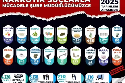 Manisa İl Emniyet Müdürlüğü, 2025 yılında düzenlenen uyuşturucu operasyonlarında 5 bin 138 şüpheli yakaladı, bunlardan 710'u tutuklandı. Operasyonlar kapsamında yarım milyondan fazla sentetik ecza hap...