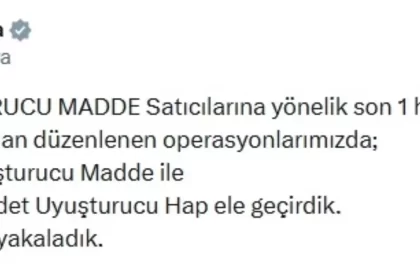 İçişleri Bakanı Ali Yerlikaya, 65 ilde gerçekleştirilen narkotik operasyonlarında 354,5 kilogram uyuşturucu madde ve 647 bin 798 uyuşturucu hap ele geçirildiğini açıkladı. Operasyonlarda 768 şüpheli y...